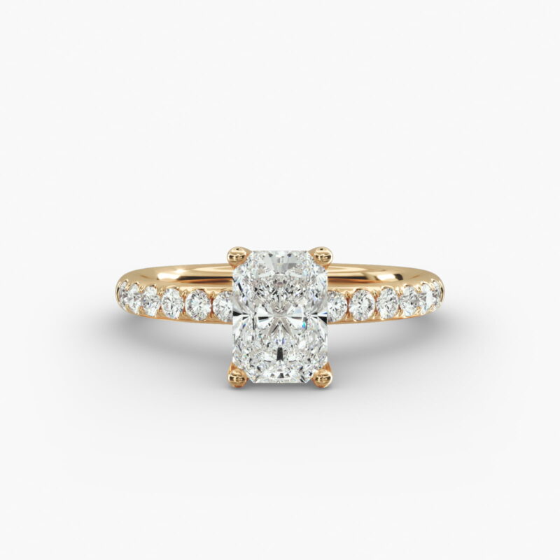 The focal point of this masterpiece is a phenomenal 3.00 carat GIA-certified radiant diamond. This gem is in the top echelon of diamond quality, featuring a perfect D color grade—meaning it is completely colorless—and an exceptional VVS2 clarity grade, signifying inclusions that are almost impossible to detect. The Ideal Cut ensures this 3 carat radiant cut diamond maximizes light return, resulting in a mesmerizing, fiery sparkle. This combination of size and quality makes this radiant cut diamond ring 3 carat a truly rare find.The Delicate Mini Micropavé Setting