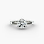 At the center of this ring is a spectacular 7 carat GIA-certified round diamond. With an exceptional E color grade, this diamond is near-colorless and radiates a pure, brilliant white light. Its VS2 clarity ensures the stone is eye-clean, and its Excellent cut, polish, and symmetry ratings guarantee maximum fire and scintillation. The sheer size of this diamond makes it a truly rare and unforgettable centerpiece.