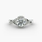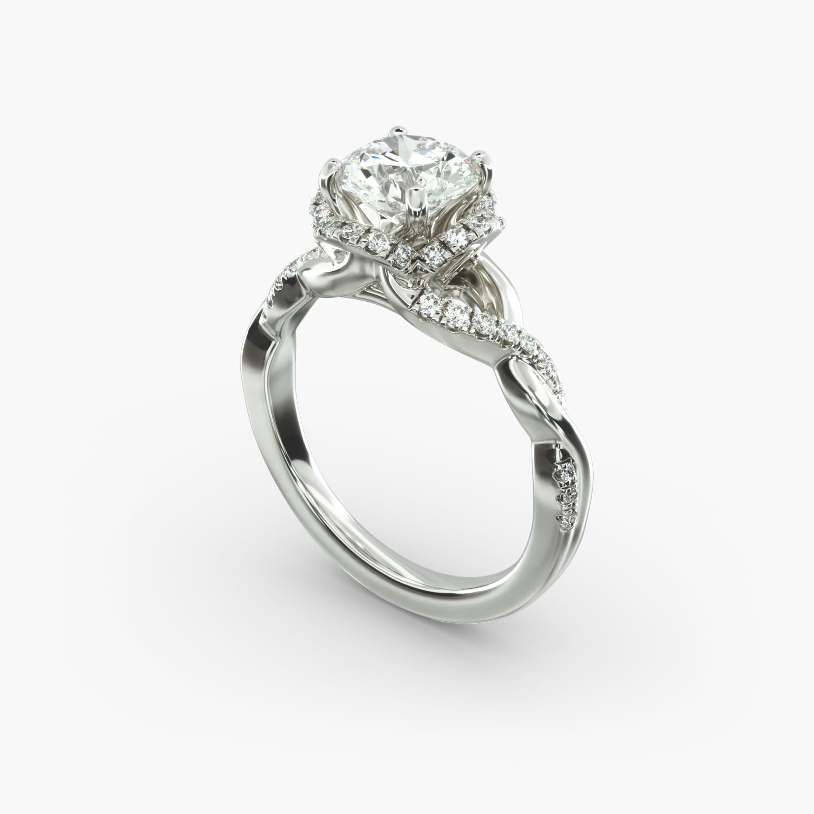 This antique looking engagement ring features a twisted braid of pavé diamonds that weaves and forms delicate loops, creating an elegant, graceful design. The ball prongs complete this stunning piece, providing a classic, timeless touch that showcases the center stone beautifully.