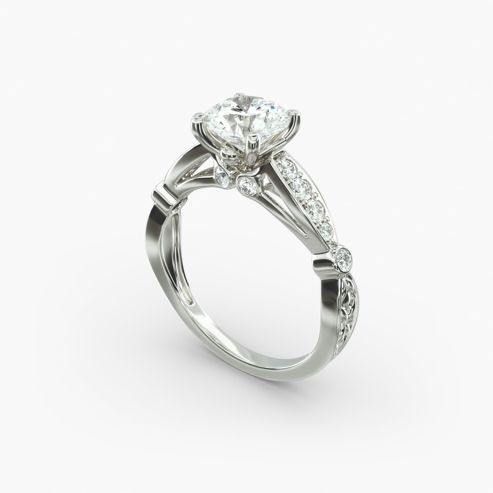Embrace the charm of vintage-inspired elegance with this antique looking engagement ring. Double bezel accents frame your center diamond or gemstone, while the graduated Pavé shoulders and embossed designer shank create a unique and intricate design. Perfect for those seeking a timeless piece with a touch of sophistication.