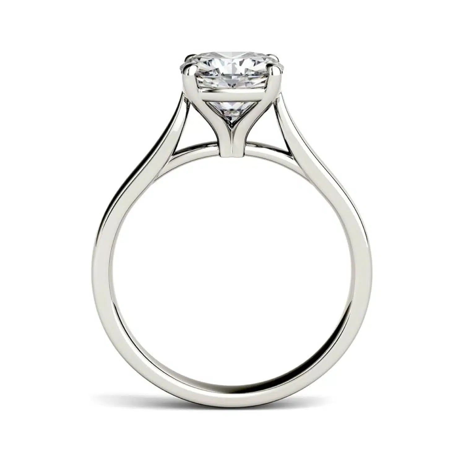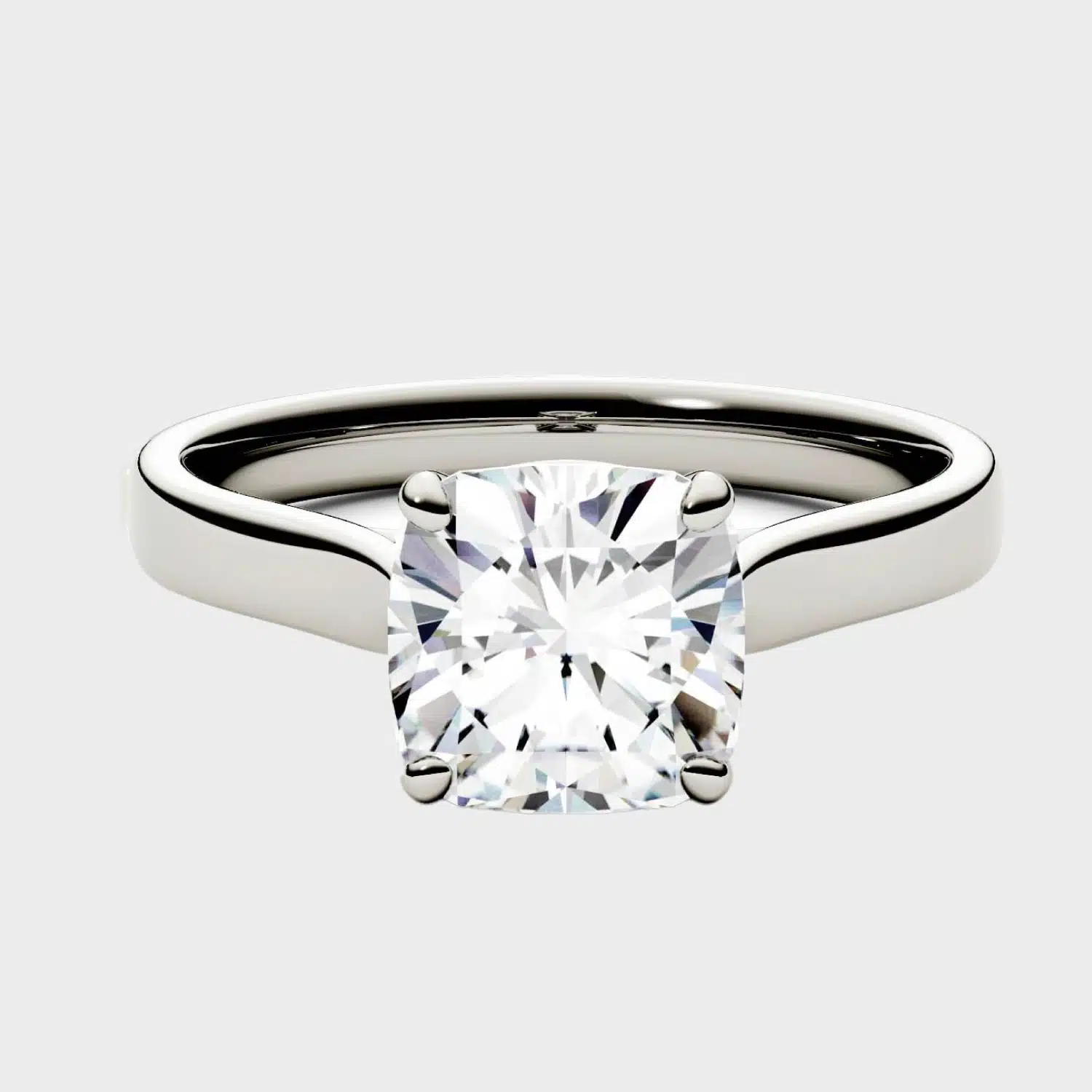 A timeless 7.5mm cushion-cut moissanite solitaire in 14K white gold, perfect for those seeking elegant engagement rings below 1000.