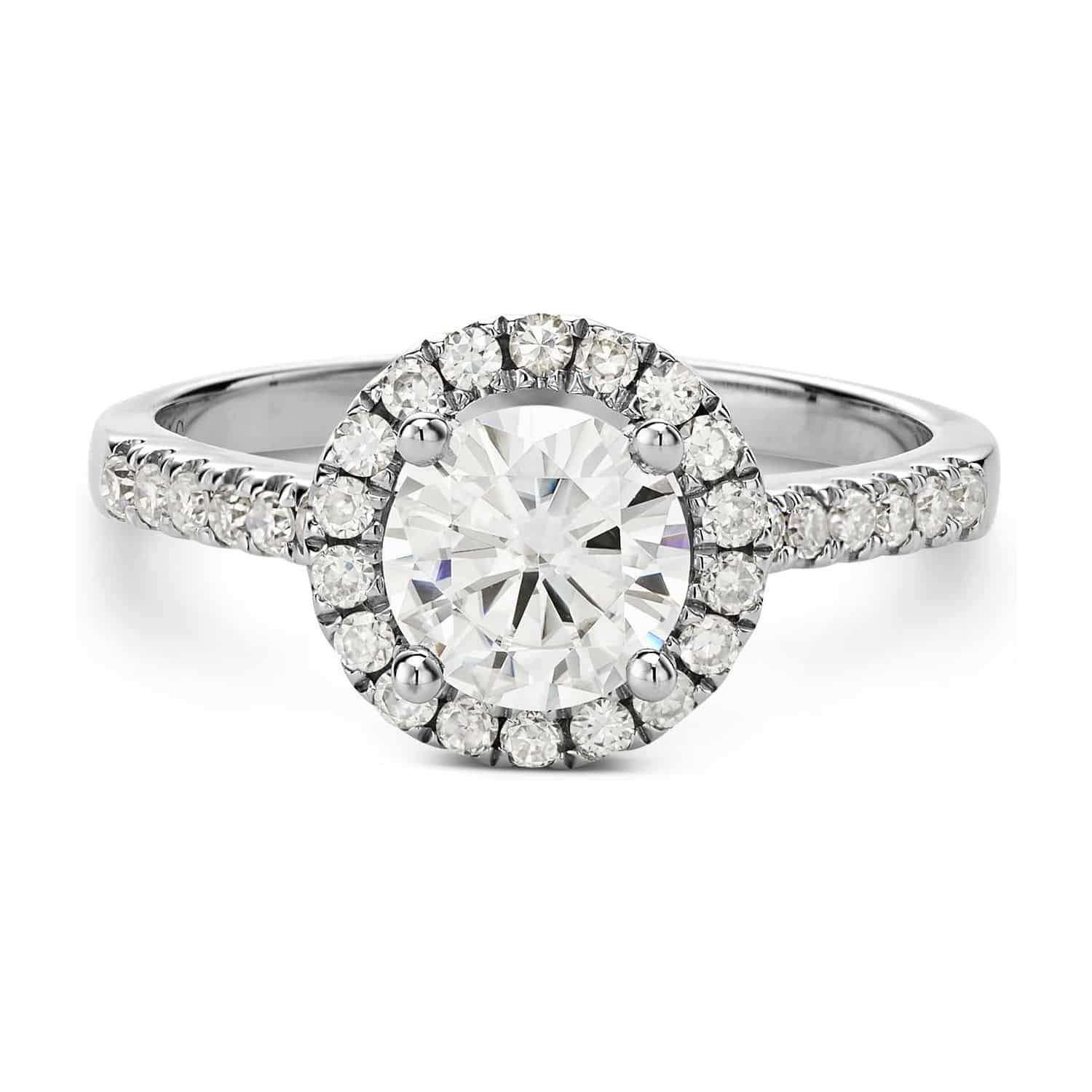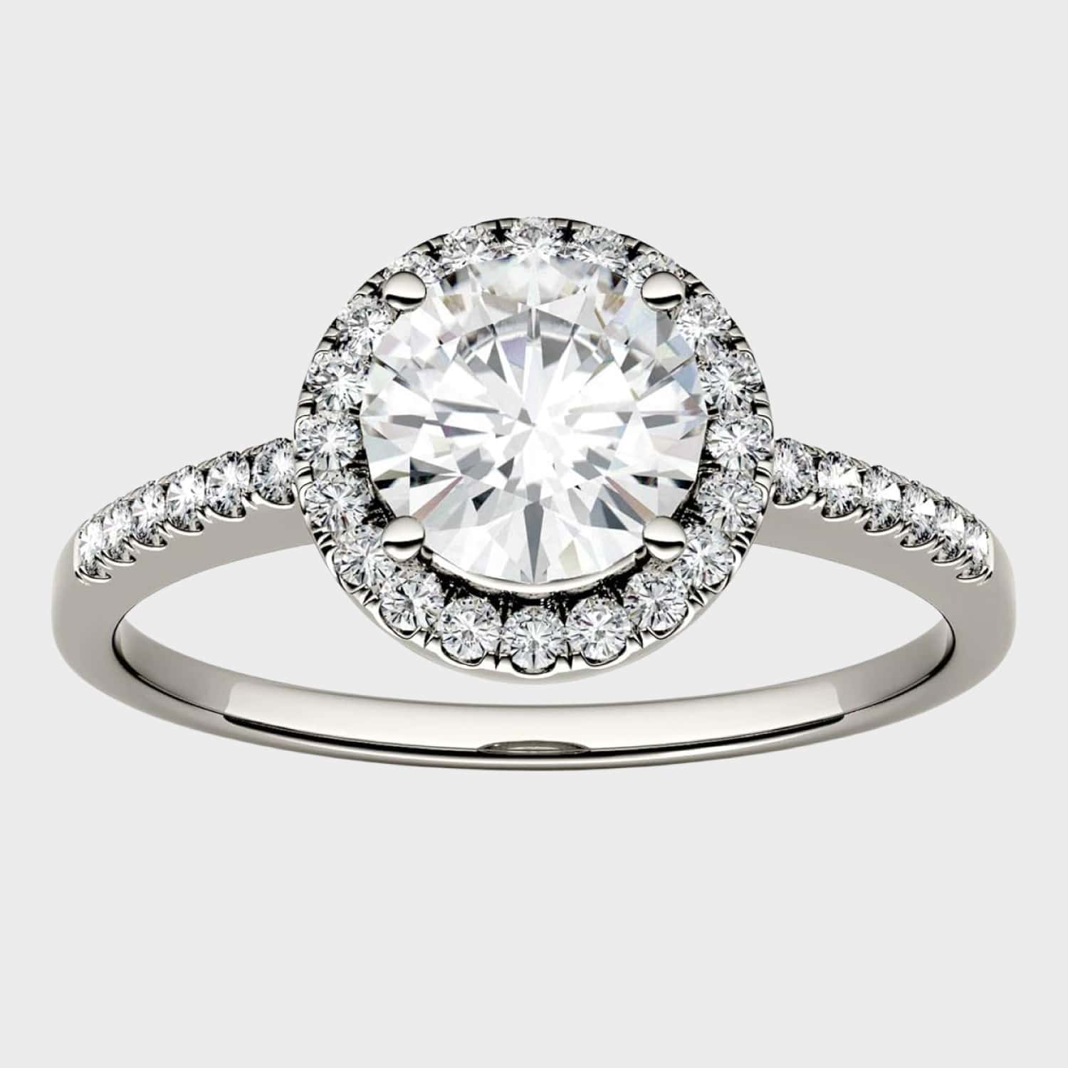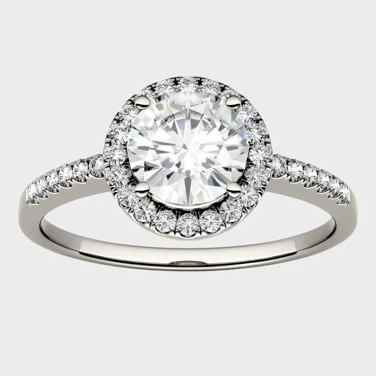 Charming Design: This stunning halo engagement ring showcases a 6.5mm round brilliant-cut Moissanite by Charles & Colvard. It is beautifully crafted in rhodium-plated 14K white gold, secured in a classic four-prong setting. With a total diamond equivalent weight (DEW) of 1.30 carats, this piece radiates brilliance and sophistication, making it a perfect option for those seeking both style and value.
