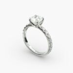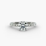 The French Cut Pavé Engagement Ring in Platinum is a perfect marriage of vintage charm and modern durability. Priced at $1,850, it offers exceptional value for those seeking Engagement Rings Under $2,500 without sacrificing the prestige of a platinum setting. This design is characterized by its “rounded wire shank,” which provides a comfortable, low-profile fit while maximizing the surface area covered in diamonds.